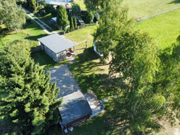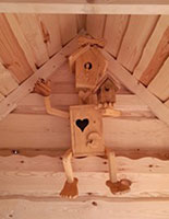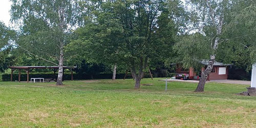 Blick auf Küchenhütte und Carport mit Tischtennis und Tischkicker